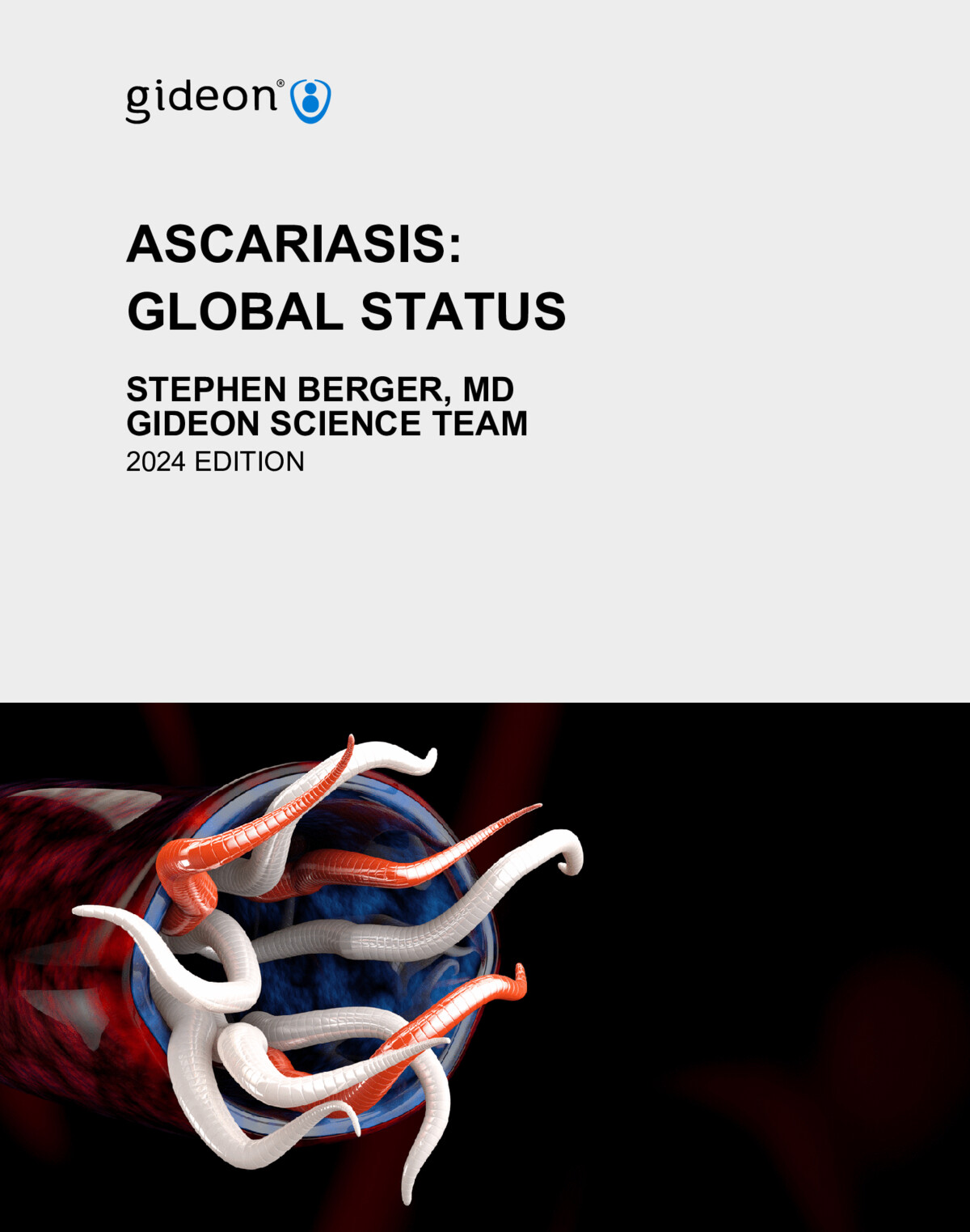 Ascariasis: Global Status is one in a series of GIDEON ebooks which explore all individual infectious diseases, drugs, vaccines, outbreaks, surveys and pathogens in every country of the world. Data are based on the GIDEON web application (www.gideononline.com) which relies on standard text books, peer-review journals, Health Ministry reports and ProMED, supplemented by an ongoing exhaustive search of the medical literature.