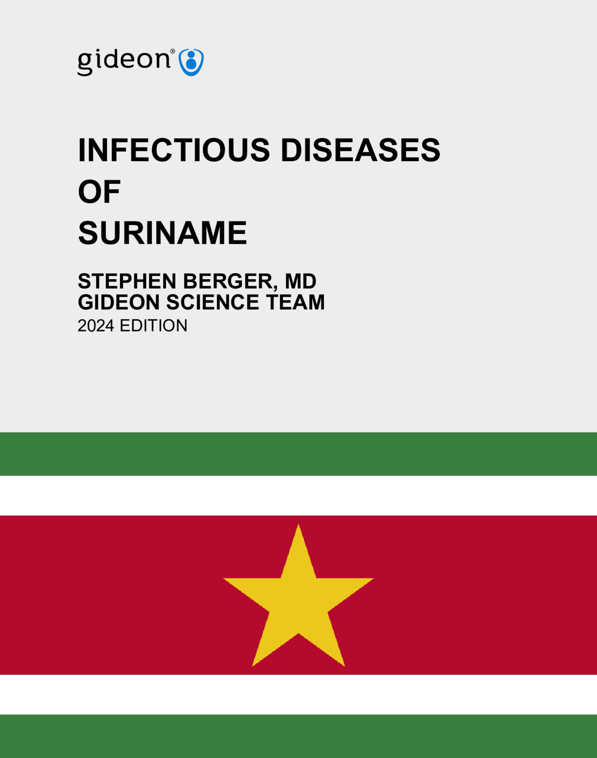 Infectious Diseases of Suriname is one in a series of GIDEON ebooks which explore all individual infectious diseases, drugs, vaccines, outbreaks, surveys and pathogens in every country of the world. Data are based on the GIDEON web application (www.gideononline.com) which relies on standard text books, peer-review journals, Health Ministry reports and ProMED, supplemented by an ongoing search of the medical literature.